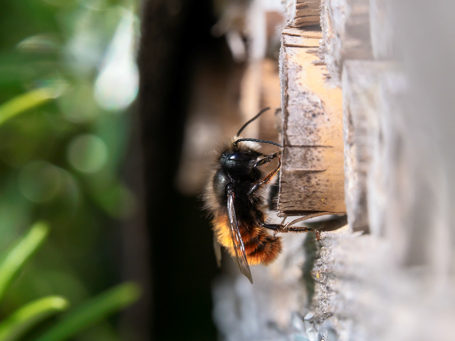 Das Bild zeigt eine Nahaufnahme (Makro) einer Wildbiene, die sich in einem runden Nisthilfen-Röhrchen befindet. Die Biene ist detailliert zu sehen, mit ihren feinen Haaren und den großen Facettenaugen. Die Farben sind natürlich und warm, mit einem Fokus auf die braunen und schwarzen Töne der Biene und des Nisthilfenmaterials. Die Stimmung wirkt ruhig und naturverbunden, da die Biene in ihrem natürlichen Lebensraum zu sehen ist. Die Perspektive ist frontal und sehr nah, wodurch die feinen Details der Biene hervorgehoben werden.